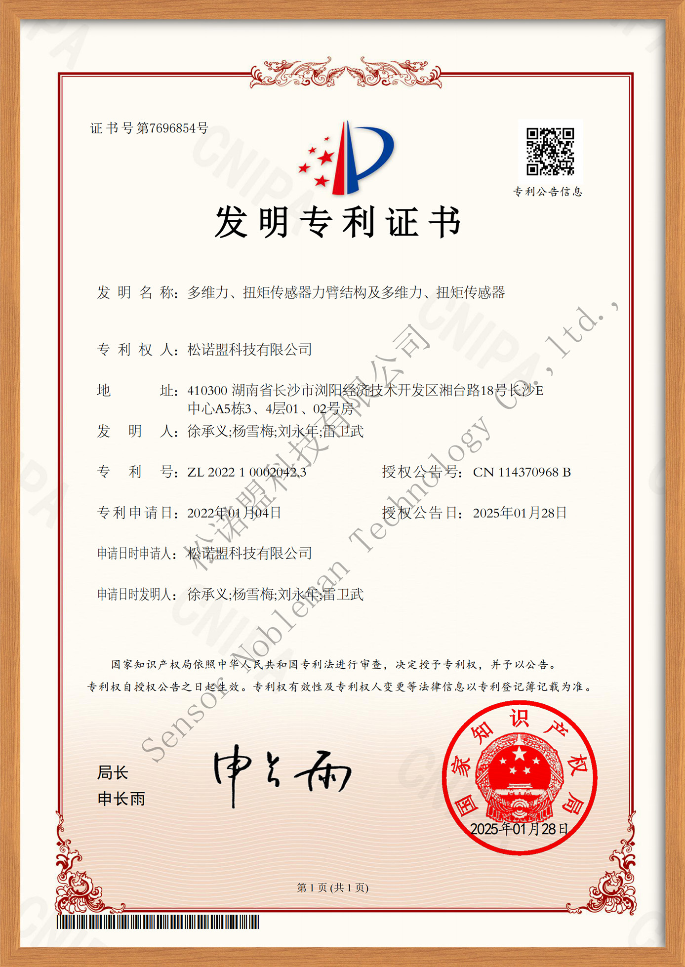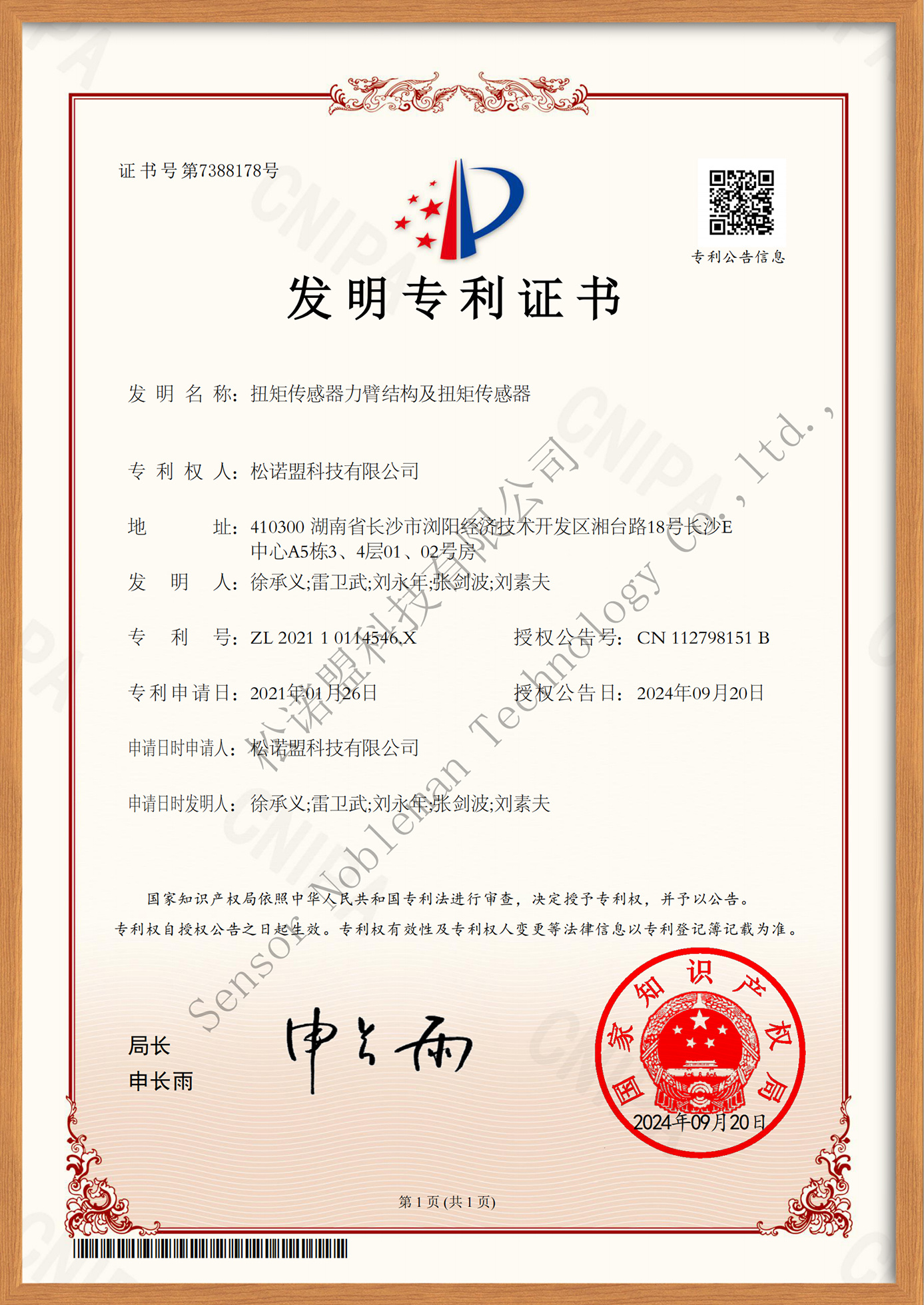 67-美国发明证书-扭矩传感器力臂结构及扭矩传感器
