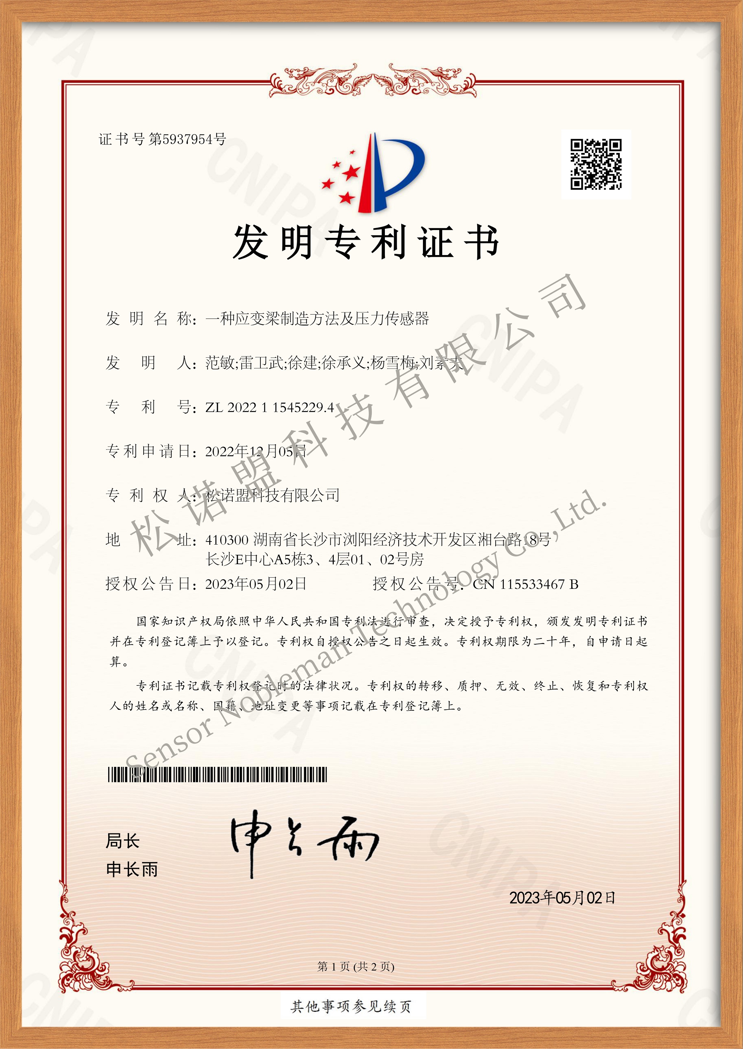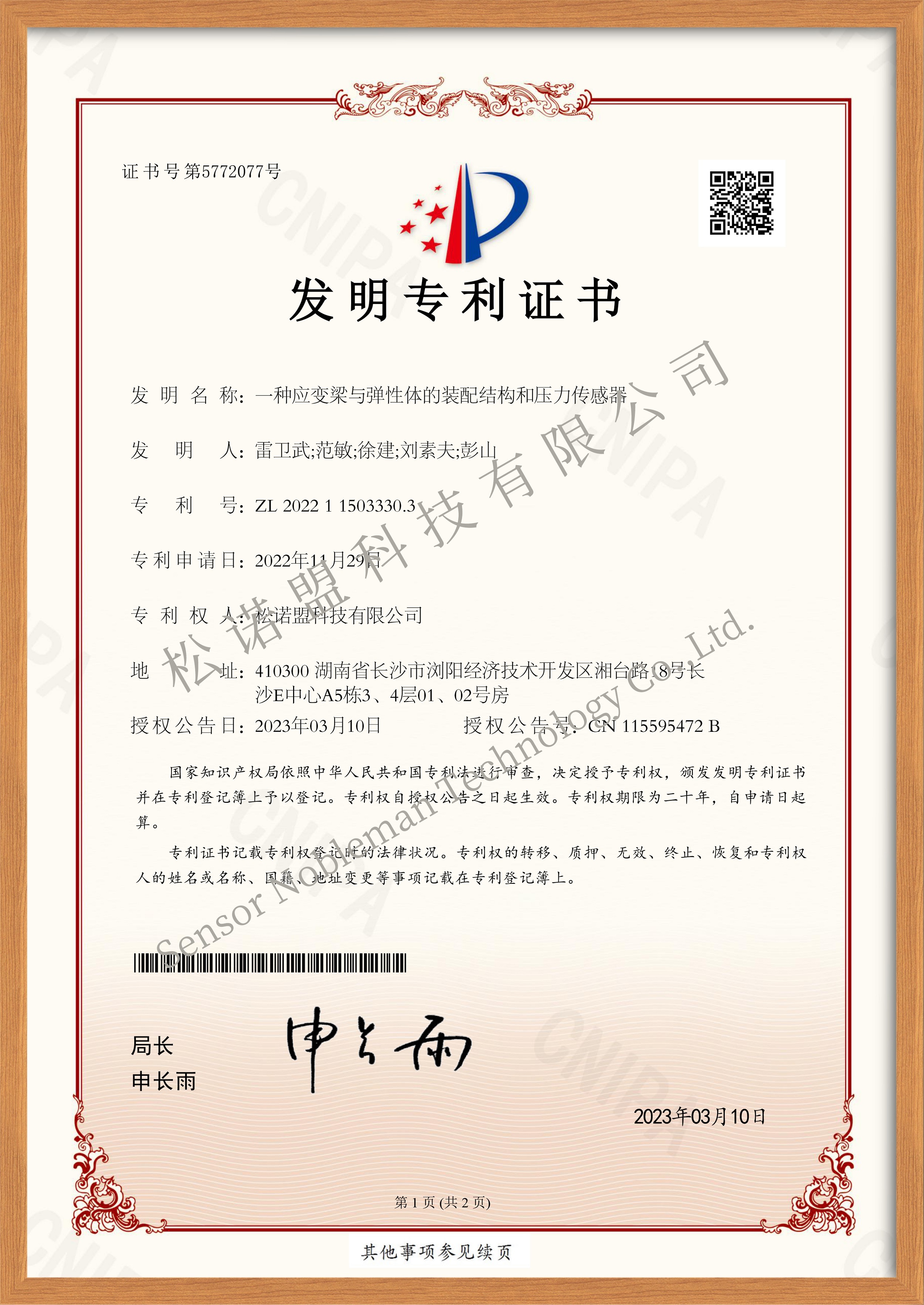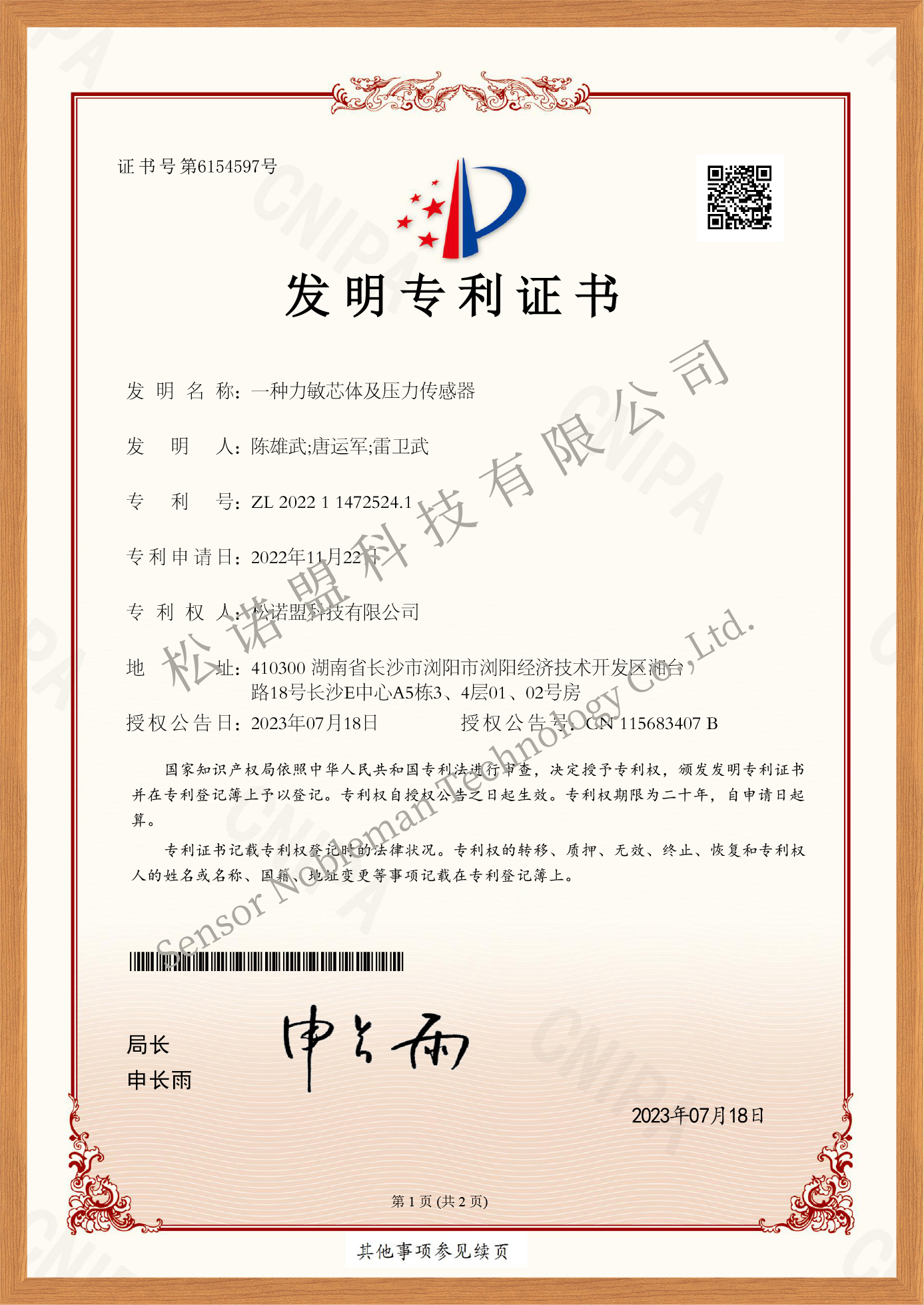 75-一种力敏芯体及压力传感器202211472524.1发明专利证书..松诺盟