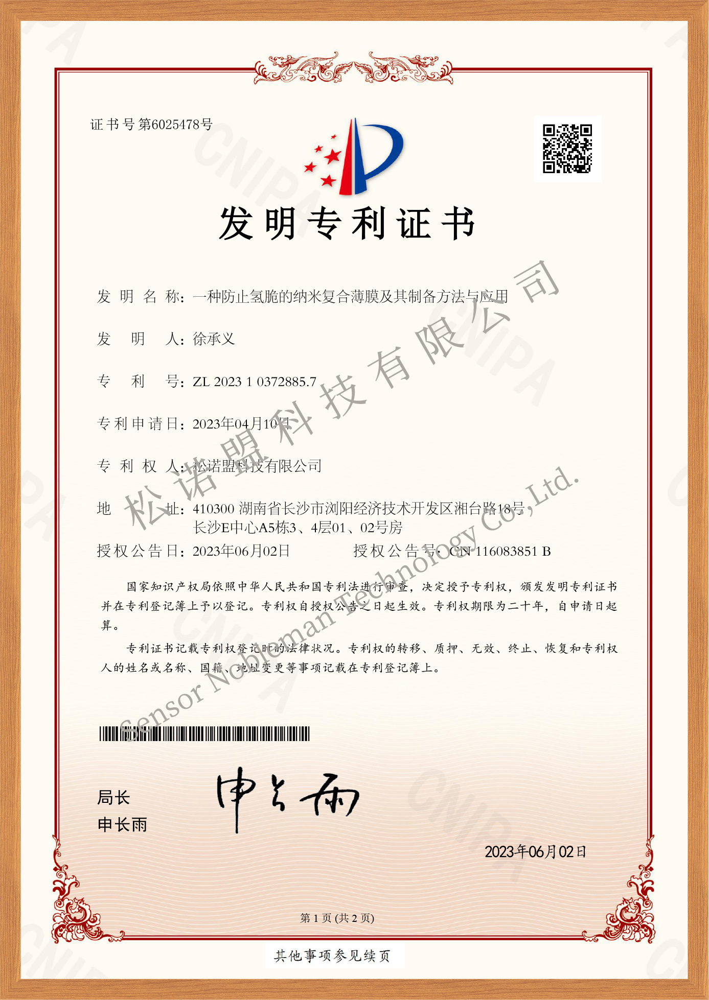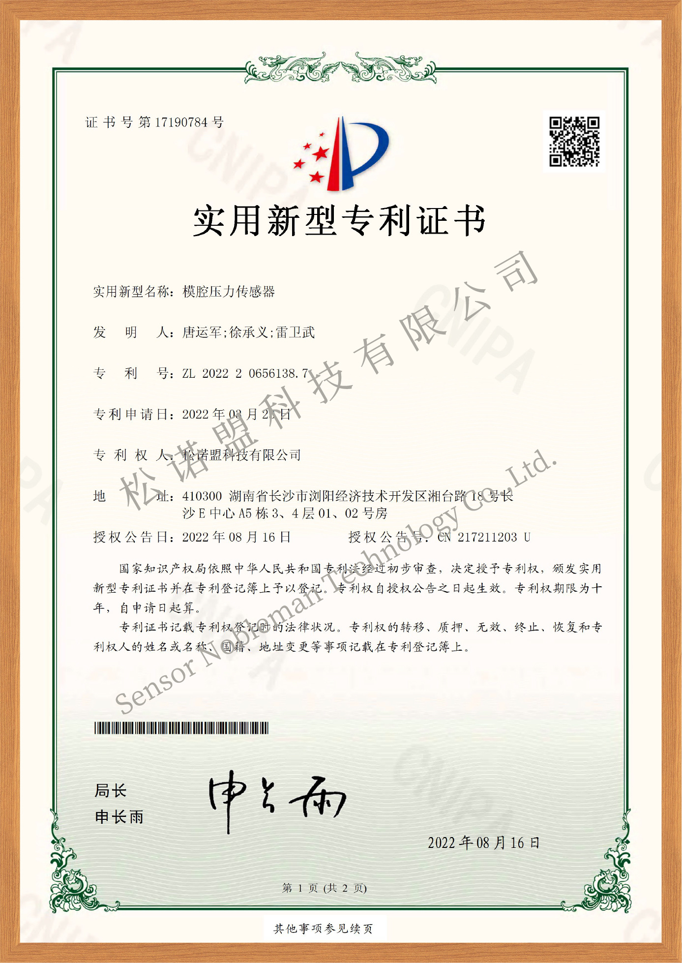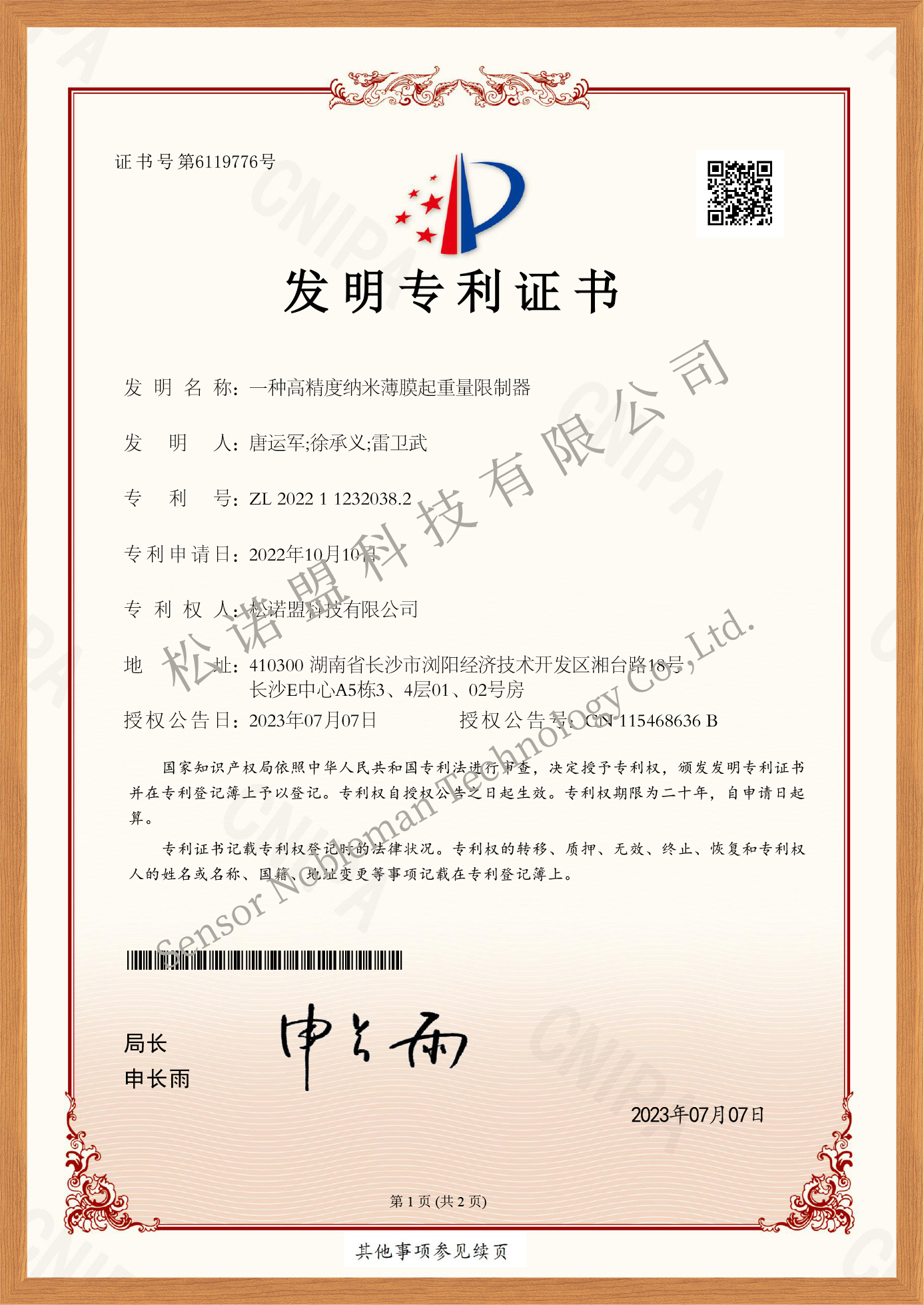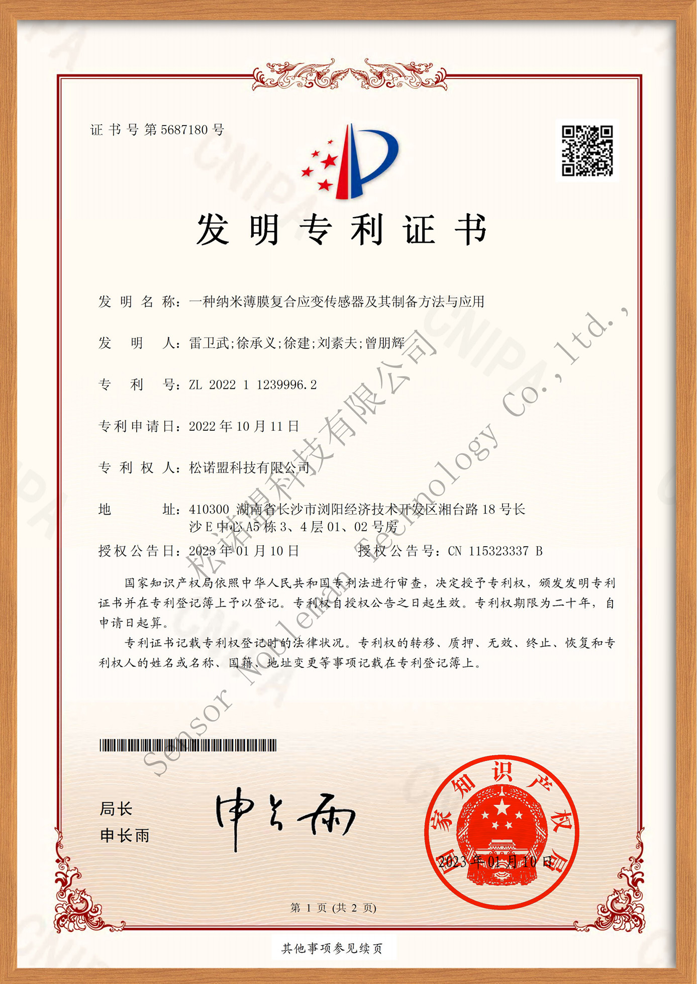 75-一种力敏芯体及压力传感器202211472524.1发明专利证书..松诺盟