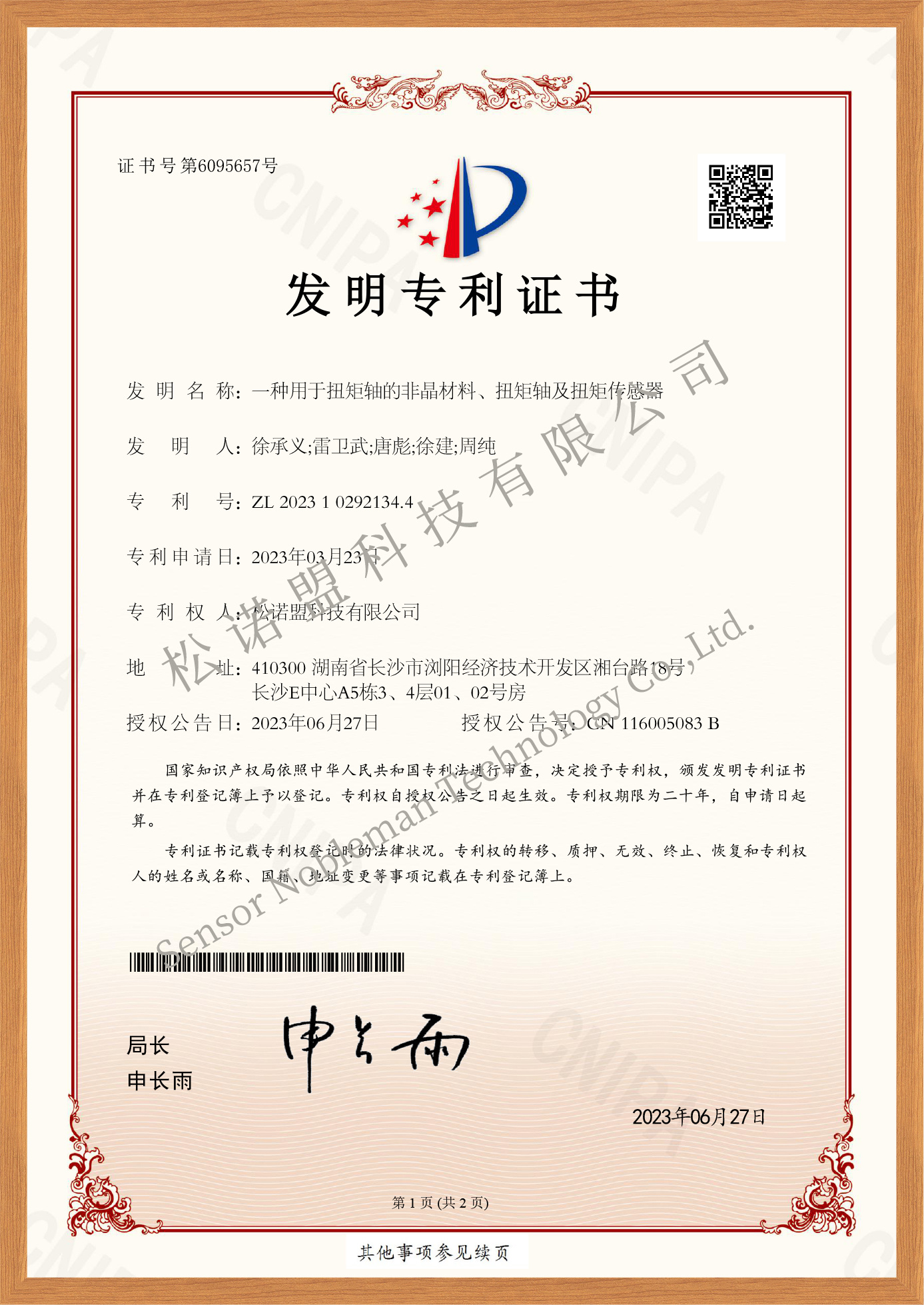 73-一种用于扭矩轴的非晶材料、扭矩轴及扭矩传感器-发明专利证书