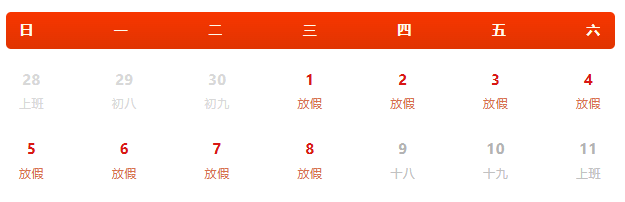 10月1日(星期三)至10月8日(星期三)放假调休,共计8天温馨时光。